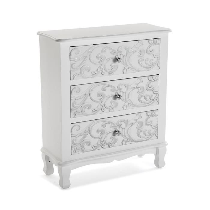 Commode blanche de 3 tiroirs en bois MDF aux finitions ornées de dessins avec des poignées en verre. Retrait Gratuit sous 2h en magasin Livraison sur RDV à létage et dans la pièce de votre choix. Le principal étant que votre commode se marie parfaitement avec votre décoration mais surtout quelle réponde à vos besoins.